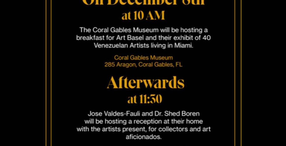 On December 8th at 10 am the Coral Gables Museum held a breakfast for Art Basel and their exhibit of forty Venezuelan artists living in Miami and afterwards Jose Valdes-Fauli and Dr. Shed Boren hosted a reception at their home with the artists present for collectors and art aficionados.